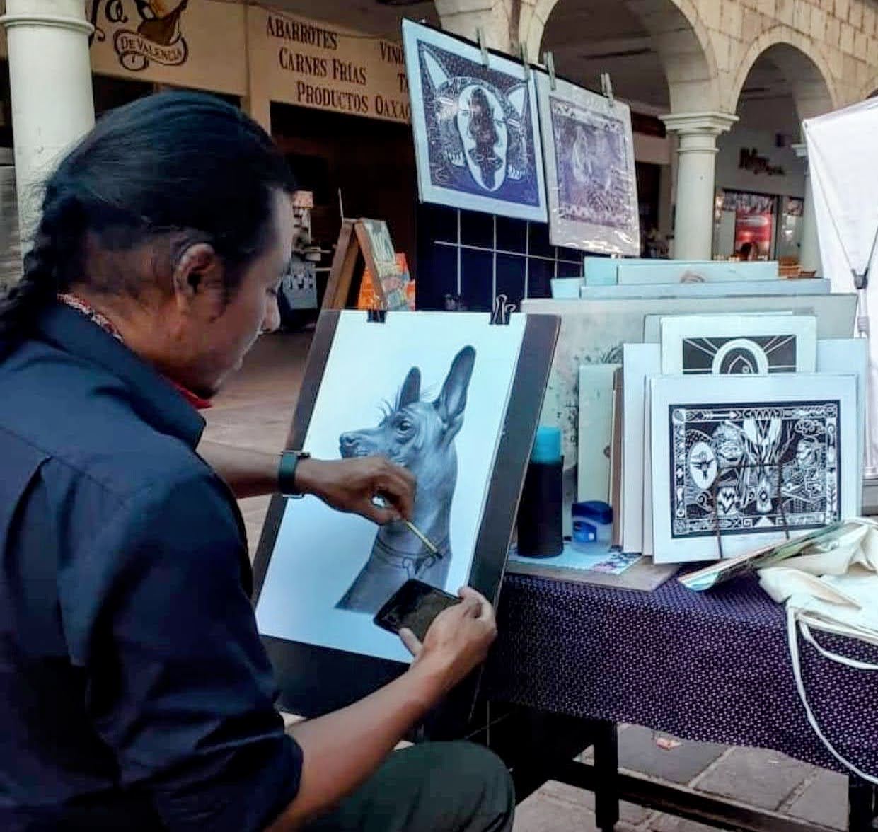 Thanks to the rich artistic history of Oaxaca, Mexico and the contemporary influence of the master painter Francisco Toledo, I was drawn deeper into painting, utilizing the techniques of oil paints, watercolor, sculpture and traditional visual arts. I then connected my urban experience with an academic one, studying art in different studios with different teachers where I learned lithography, wood carving, ceramics, and ink techniques. During this time, I continued painting murals, both individually and in collective groups.