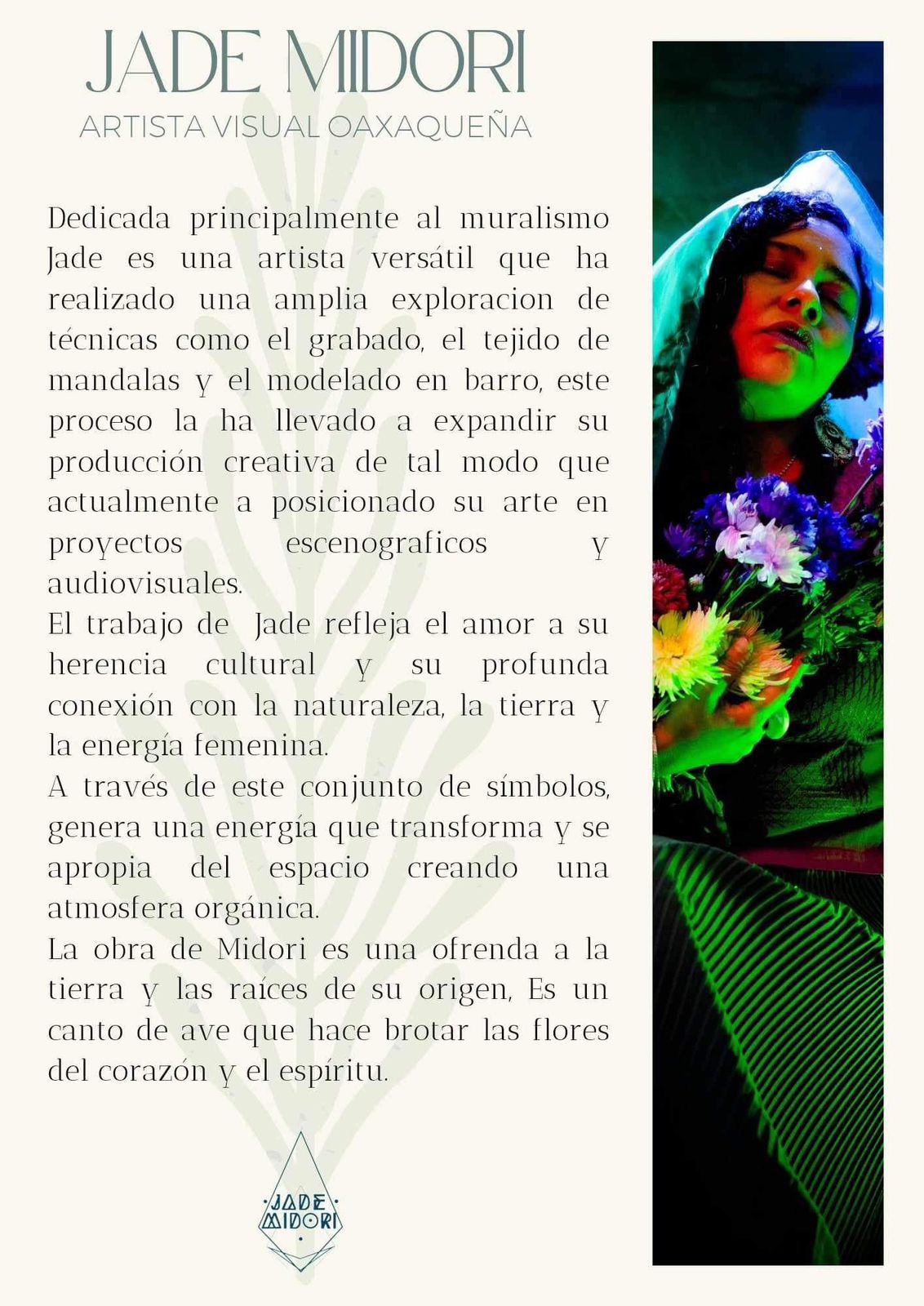 Jade Midori is a Oaxacan visual artist, dedicated primarily to muralism. With a 15-year career in urban art, she began doing graffiti and studied visual arts in a self-taught manner, exploring various techniques of engraving, weaving, clay modeling, installation, and conceptual art, thus creating a broad artistic production.